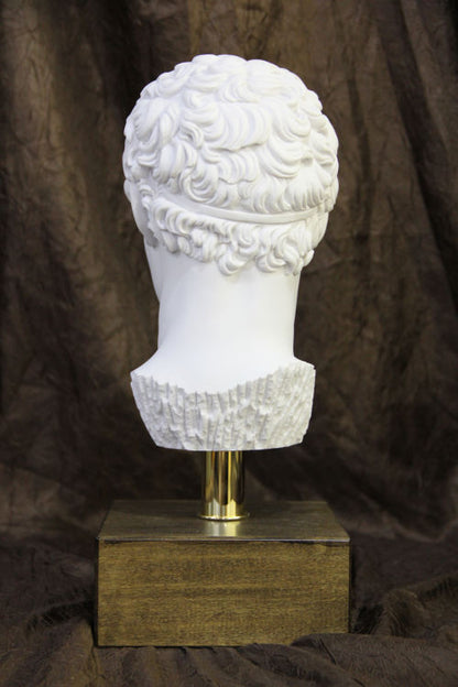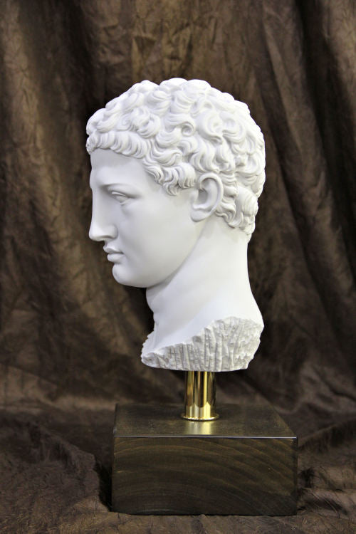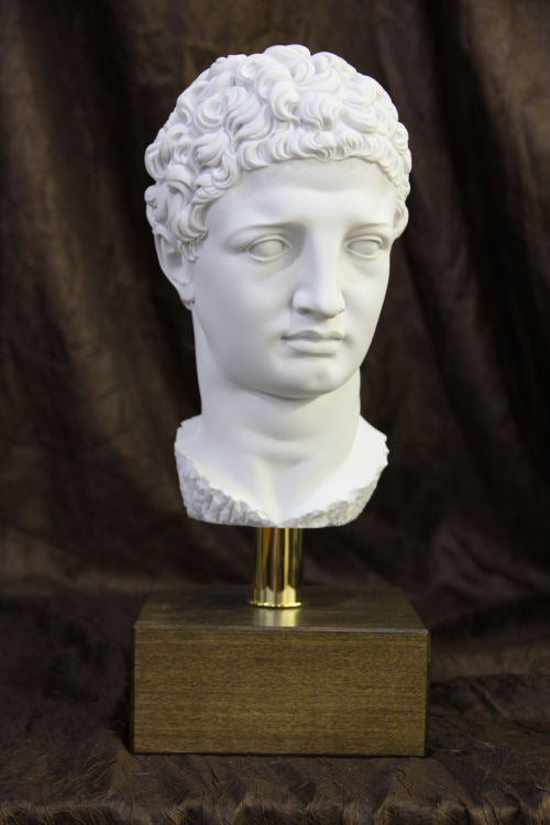 Hermes Bust 16" High is made of alabaster dust mixed with a durable binding compound, each detail is finished with care by the artisans of Italy's Egregia Workshop. Mounted on a rod with wood base. Hermes, the <span style='display: inline !important; float: none; background-color: transparent; color: rgb(0, 0, 0); font-family: "tahoma"; font-size: 16px; font-style: normal; font-variant: normal; font-weight: 400; letter-spacing: normal; orphans: 2; text-align: left; text-decoration: none; text-indent: 0px; text-transform: none; -webkit-text-stroke-width: 0px; white-space: normal; word-spacing: 0px;'>Head Of Hermes by Praxiteles</span> of the gods, is one of the most revered images in Greek art. Our classic replica bust is faithfully replicated in bonded Alabaster marble to capture the original sculptural character and to add classical style to your home gallery. Head Of Hermes by Praxiteles (4th century B.C.) It has been said that in the fourth century, the gods descended a little from Olympus and became more like human beings. That might have been said concerning this magnificent work of Praxiteles. With his Hermes the abstract beauty has become more closely related to physical beauty. It is as though the master had changed marble to flesh through the soft modeling of the face. The head has been made from the full figure of Hermes holding the infant Dionysus. It was found in the ruins of the temple of Hera at Olympia, site of the original Olympic games. Praxiteles, Skopas, and Lysippos were considered the greatest sculptors of the fourth century. We know the works of all three through Roman copies which were made, but the Hermes of Praxiteles is the only statue that has come down to us from the actual hand of one of these great sculptors. It is now in the Museum at Olympia close to the temple where it was found. Our museum quality replica of Hermes bust is wonderful for the home and office.