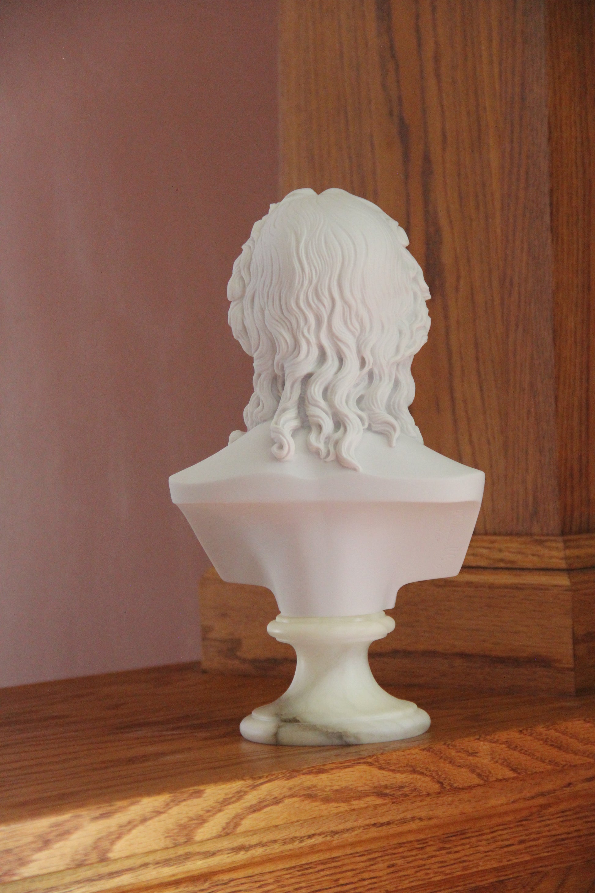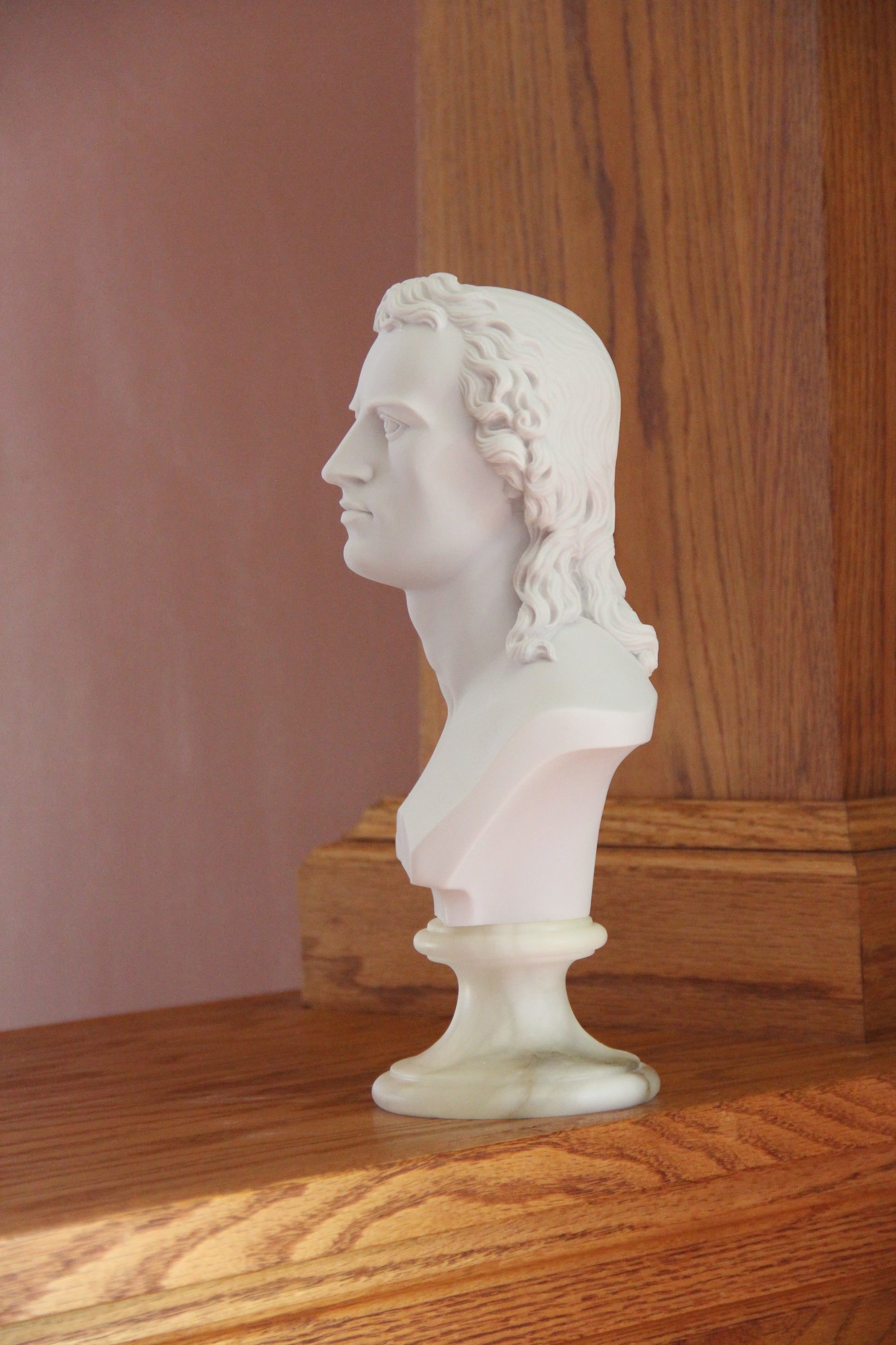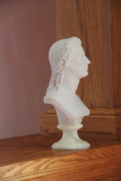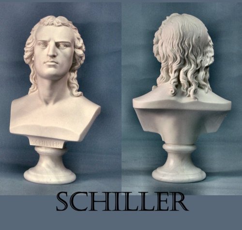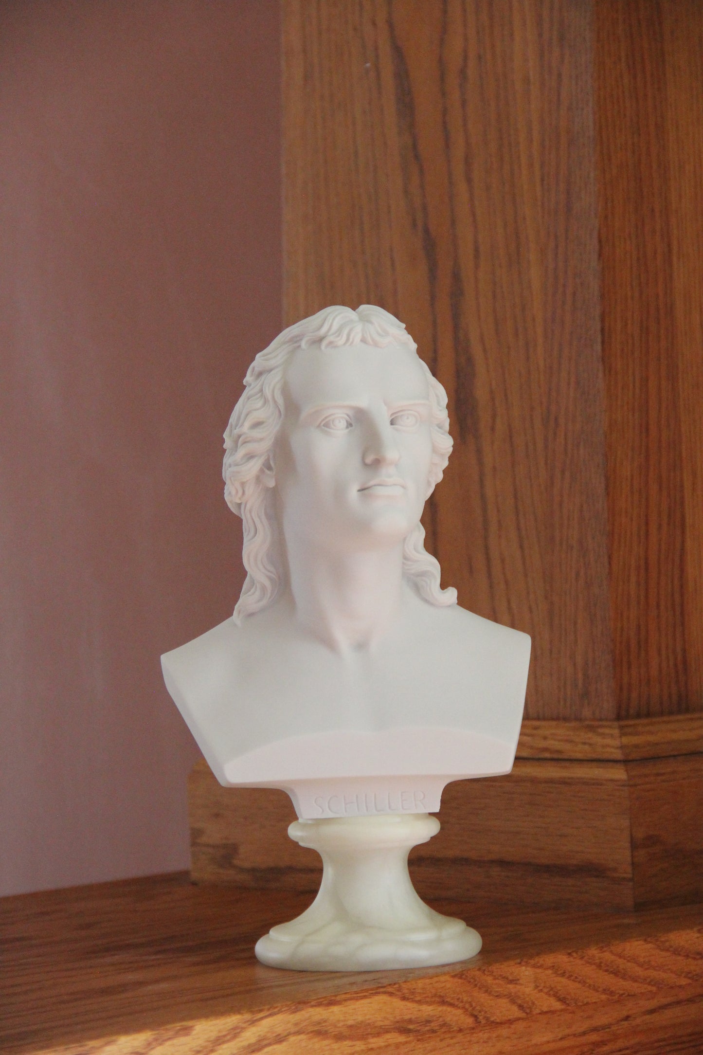 The marble bust of Friedrich Schiller gives us the young determined look of Schiller. Schiller was a was a German poet, philosopher, historian, and playwright. Friedrich Schiller a German dramatist, along with Goethe, was a major figure in German drama during the Sturm and Drang period. Schiller main issues, physical and spiritual freedom, were prevalent in his work. Friedrich Schiller had the uncanny knack of bring out the psychology of people in crisis in many of his plays, such as the Wallenstein Cycle in 1798, Mary Stuart in 1800, The Maid of Orleans in 1801, and William Tell in 1804. About German Dramatist Friedrich Schiller Johann Christoph Friedrich von Schiller was born on November 10, 1759, in Marbach, Germany and was the son of an army officer. His father worked for Duke Karl Eugen of Würtemberg. Friedrich Schiller dislike of strict regimentation caused the Duke of Würtemberg to forced him to enter the Duke\'s military academy, the Karlsschule, at the age of 13. He studied law and later turned to medicine. When he was 21 he was appointed to a Stuttgart regiment.Schiller felt trapped and overwhelmed with depression and began to compose morbid poetry. After composing his first play, The Robbers 1782, Schiller's writing was discovered by his superiors, and he was forbidden to write. The young German dramatist deserted the army, fleeing to Mannheim where he lived under an assumed name and made his living as a court playwright and stage manager.Friedrich von Schiller established a close friendship with Johann Wolfgang von Goethe. It was under Goethe\'s influence that Schiller soon returned his attentions to playwriting and started again to compose his most mature dramas.On May 9, 1805, at the age of 46, Friedrich Schiller died of tuberculosis. This bust is made of bonded Alabaster and mounted on a alabaster base. Imported from Italy.